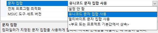 MFC(Visual C++)프로젝트의 문자 집합 설정화면 입니다.