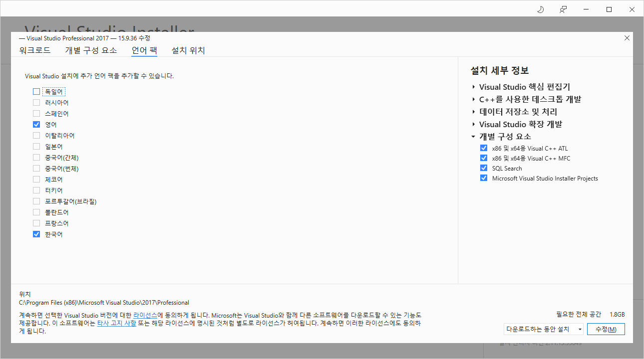 ※ Visual Studio에서 vcpkg를 사용할 수 없다면 영어 언어팩을 설치 후 다시 시도해주세요.