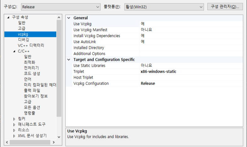 여기서 다른건 크게 건들 필요 없고 Triplet과 Vcpkg Configuration만 설정해줍니다.