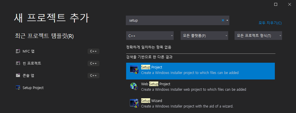 솔루션에서 우클릭 > 추가 > 새 프로젝트 메뉴를 선택하고 setup을 검색해서 Setup project를 추가합니다.