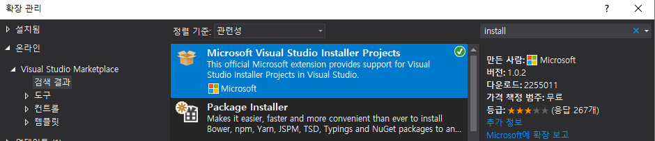 비주얼스튜디오 상단 확장 > 확장 관리 메뉴를 실행하고 install을 검색하여 위 확장프로그램을 설치합니다.