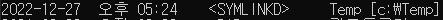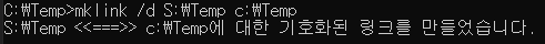 S 드라이브에서 dir로 내역을 확인해보면 <DIR>이 아니라 <SYMLINKD>로 설정되어 있고 원본 경로가 나타납니다.