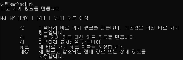 cmd(명령프롬프트)에서 mklink를 입력해보면 명령어를 확인할 수 있습니다.