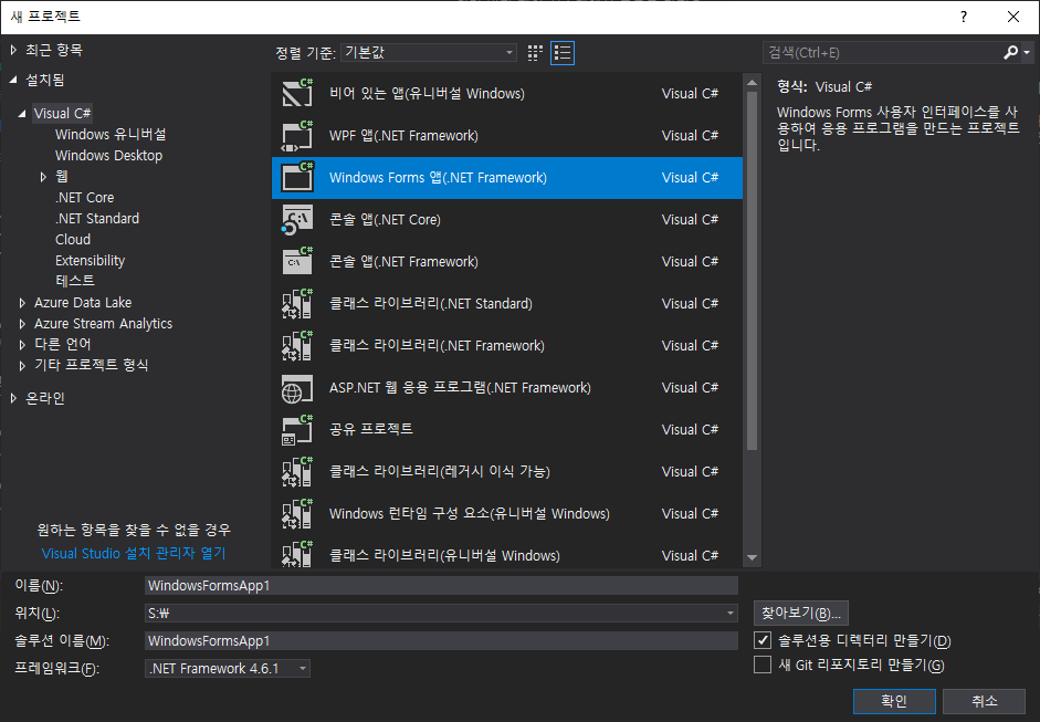 Windows Forms 앱을 선택해서 프로젝트를 하나 생성합니다.