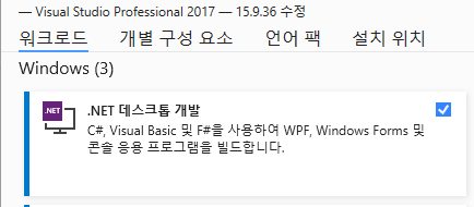 ※ 만약 목록에서 해당 프로젝트를 찾을 수 없다면 비주얼 스튜디오에 위 항목이 설치되어 있는지 확인해보세요.