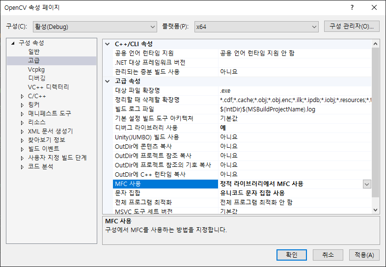 플랫폼을 64비트로 설정한 후 라이브러리를 사용하기 위한 디렉터리 세팅을 진행합니다.