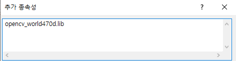 프로젝트 우클릭 > 속성 > 링커 > 입력 > 추가 종속성에 OpenCV관련 lib파일을 추가해줍니다.