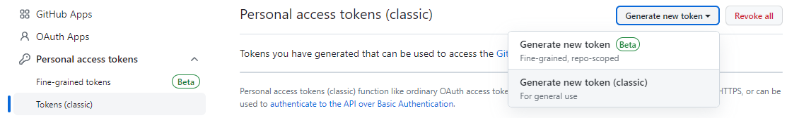 Personal access tokens > Tokens (classic) > Generate new token > Generate new token (classic) 메뉴 선택