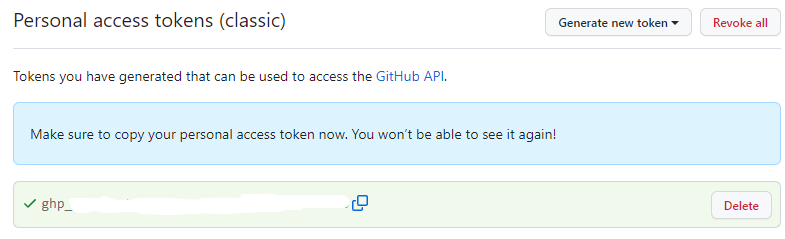 생성된 토큰은 계정 비밀번호와 저장소 주소에 사용됩니다.