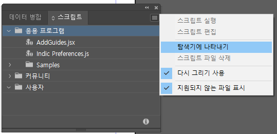 그려면 위와 같은 패널이 열리는데 기본적으로 인디자인을 설치하면 여러 가지 스크립트 샘플들도 같이 설치됩니다.