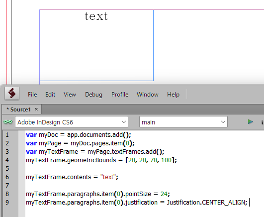 간단하게 문서를 생성하고 텍스트프레임을 만들고 텍스트를 넣고 텍스트 속성을 수정하는 코드를 작성해봤습니다.