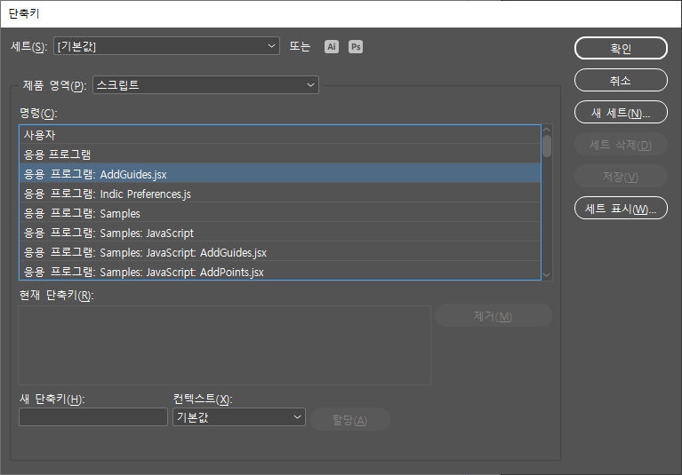 편집 > 단축키 메뉴에서 제품 영역을 스크립트로 선택하면