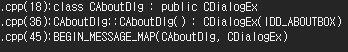 예를 들어 이런 코드가 있다고 했을 때 "CAboutDlg"과 "CDialogEx"이 한 라인에 연달아서 나오지 않고