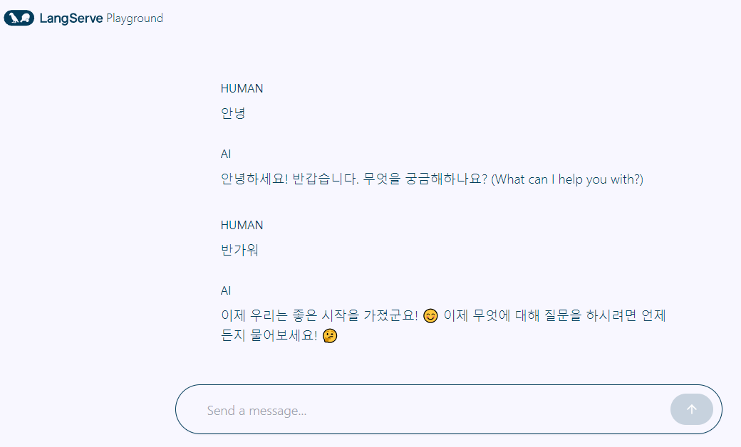 동일하게 server.py 실행 후 http://localhost:8000/ollama/playground/ 접속하면 채팅 형식으로 대화할 수 있습니다.
