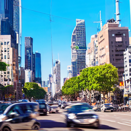 prompt = "A busy city street during rush hour, with cars, pedestrians, and tall buildings on both sides under a clear blue sky."