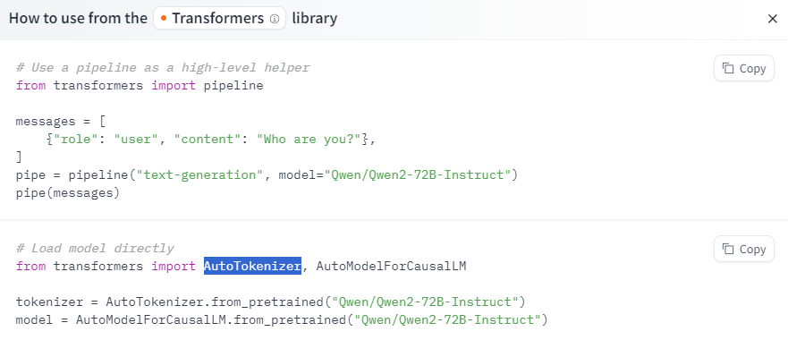 Qwen2 모델 페이지에서 우측에 있는 Use this model을 클릭하고 사용할 라이브러리를 클릭하면
