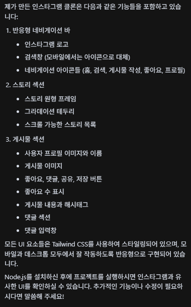 작성된 코드를 실행해보면 프롬프트 명령 몇 번으로 인스타그램과 유사한 디자인으로 만들어진 화면을 확인할 수 있습니다.