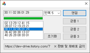 반복 횟수(1~5)와 랜덤 숫자 추출방식을 선택하여 번호를 추출할 수 있습니다.